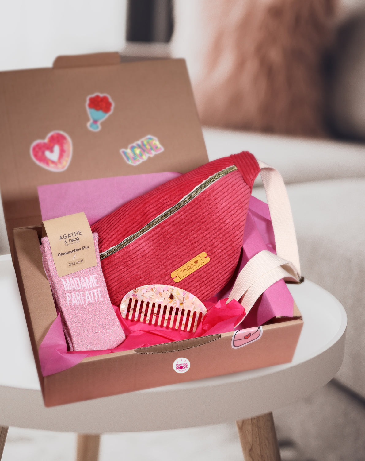 Nos colis sont préparés avec soin : cartons français et recyclables, papier de soie made in France, avec notre pink touch en plus 😊💖