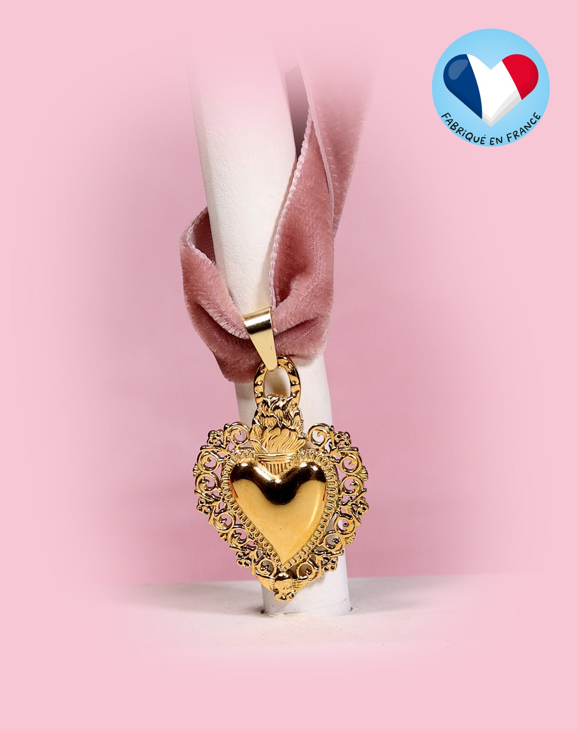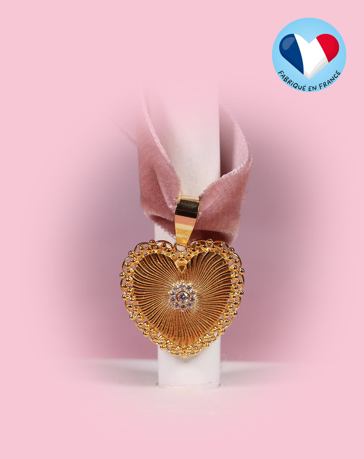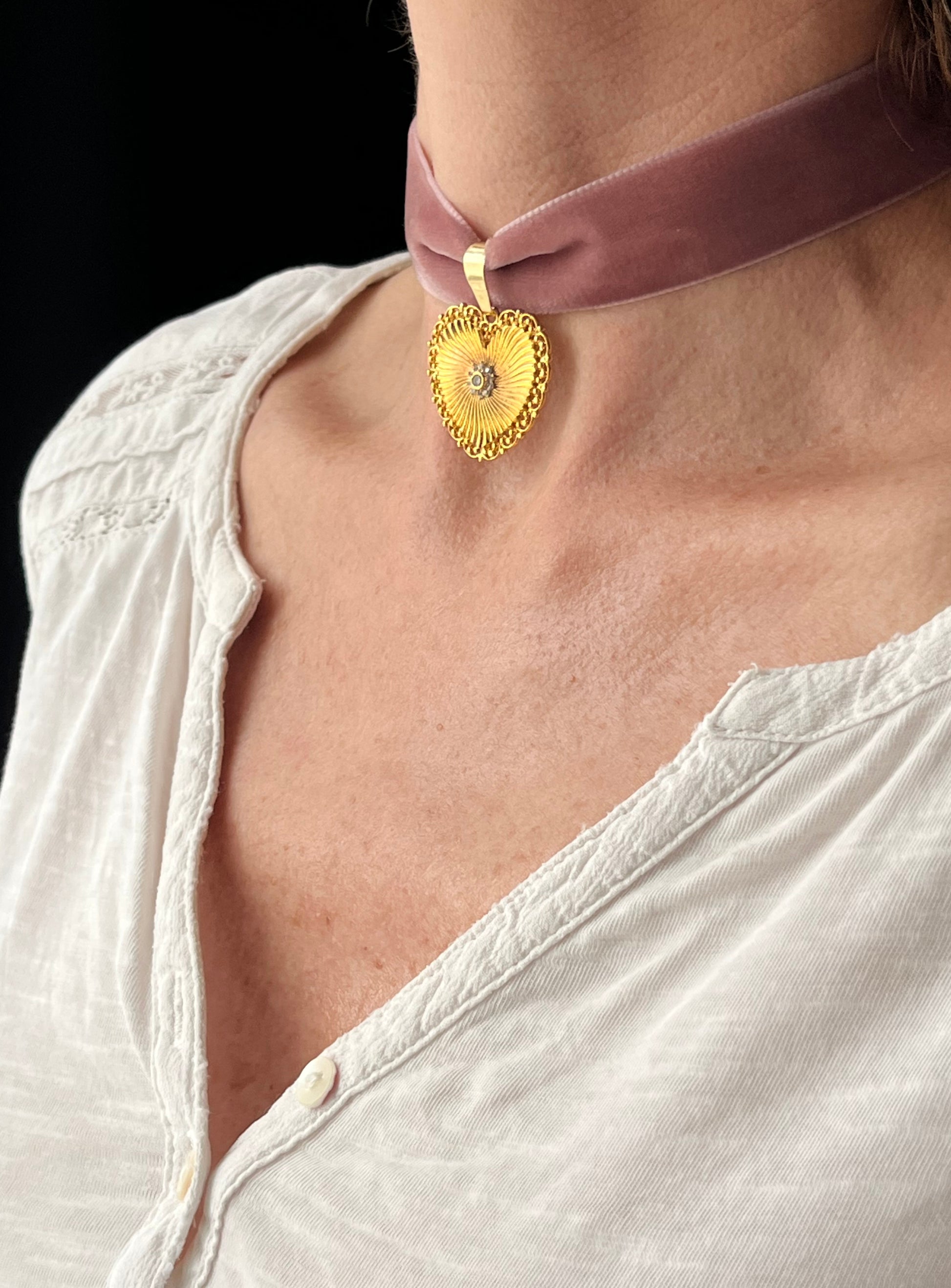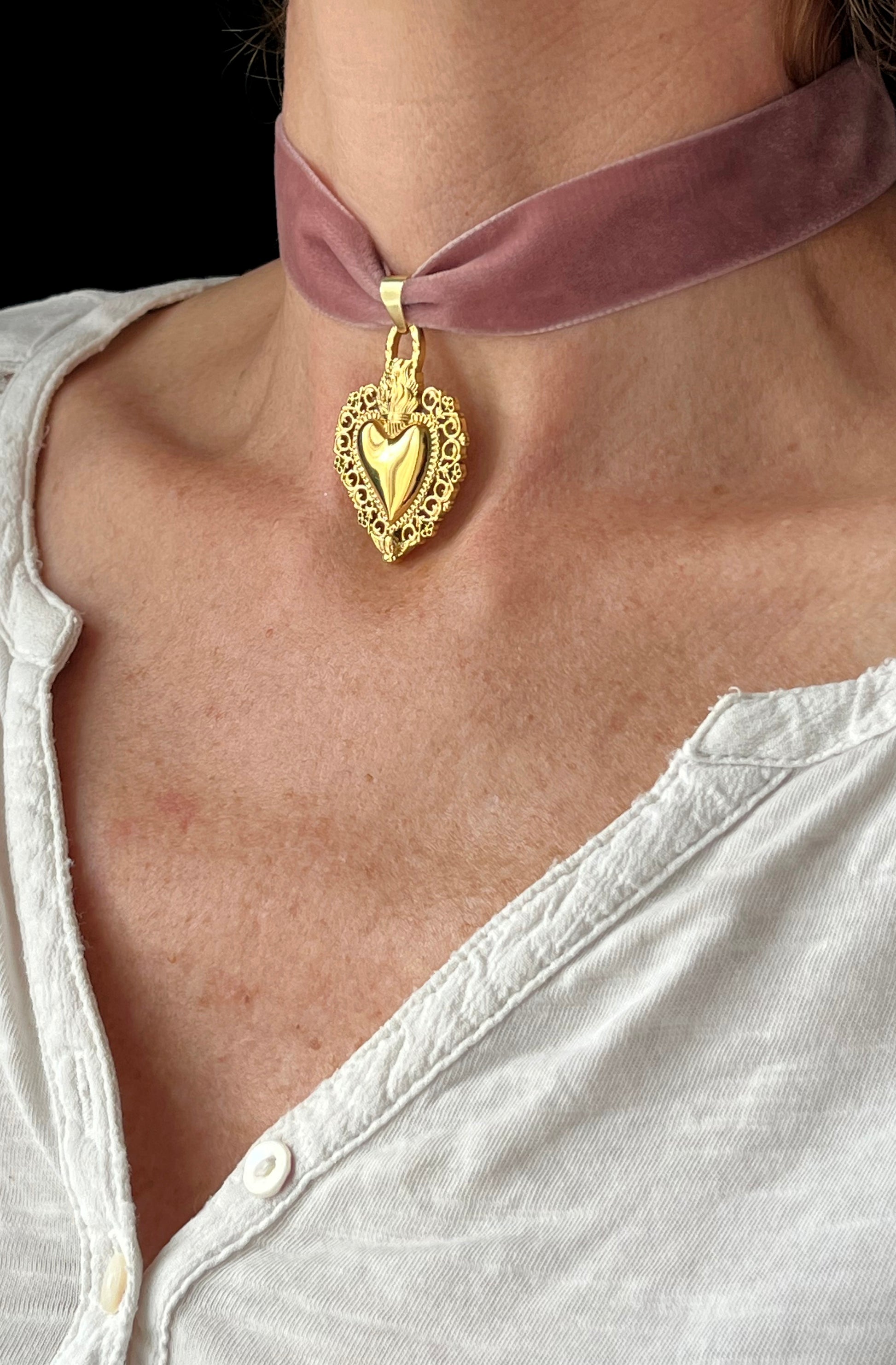 Choker en velours de soie rose au charme d’antan orné d’un pendentif cœur plaqué or. Le pendentif mesure environ 3 cm, et le ruban 30 cm + une extension, en ruban de velours et acier inoxydable doré.