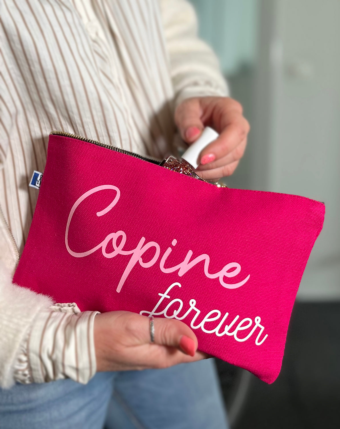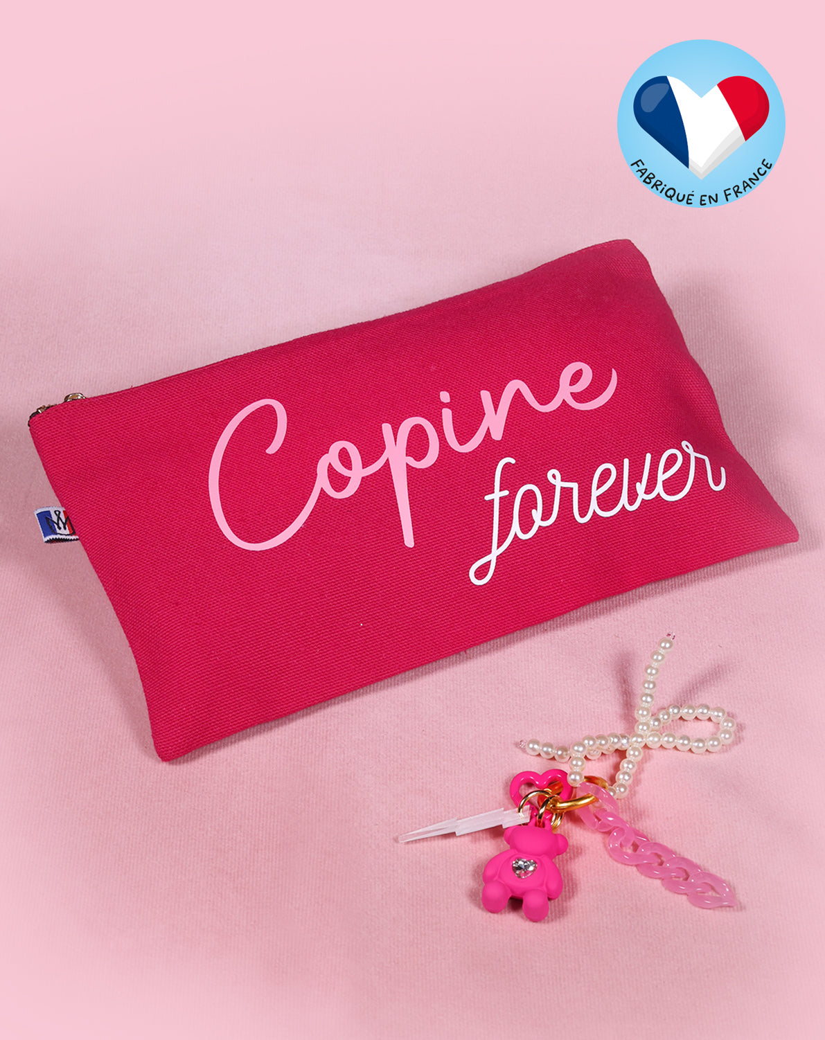 Pochette zippée fuschia ‘Copine forever’ + Gri-gri de sac
